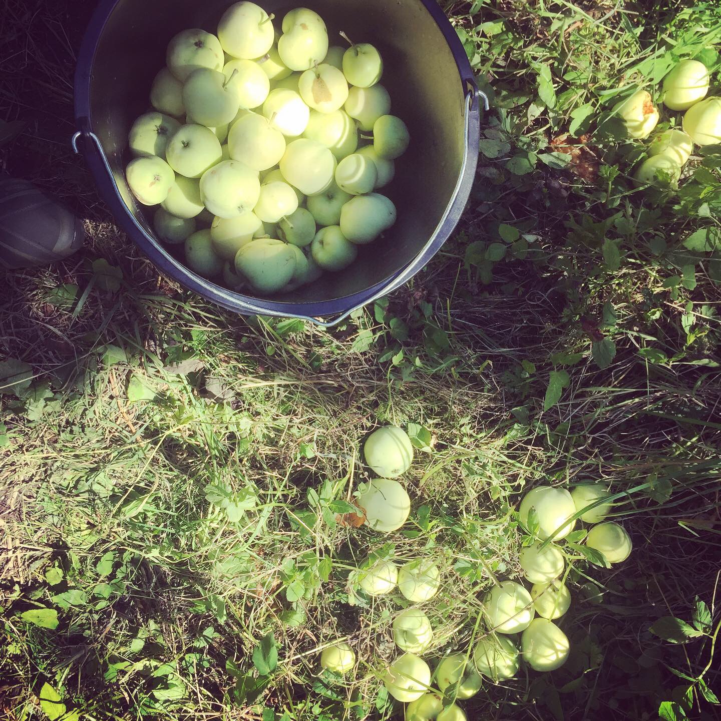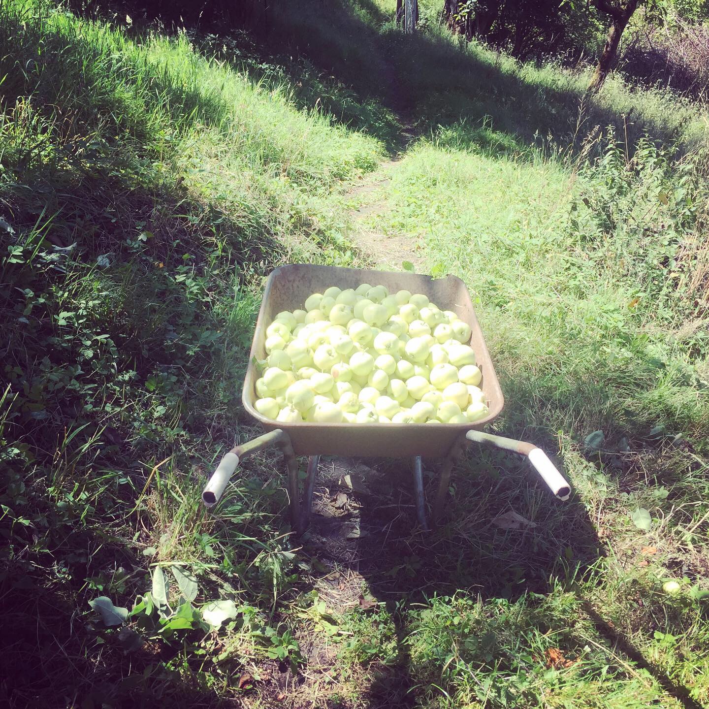 Wir haben uns in diesem Jahr für die Saftproduktion entschlossen. Zunächst also erst wird der Baum derb geschüttelt, die Äpfel werden auf- und verlesen.