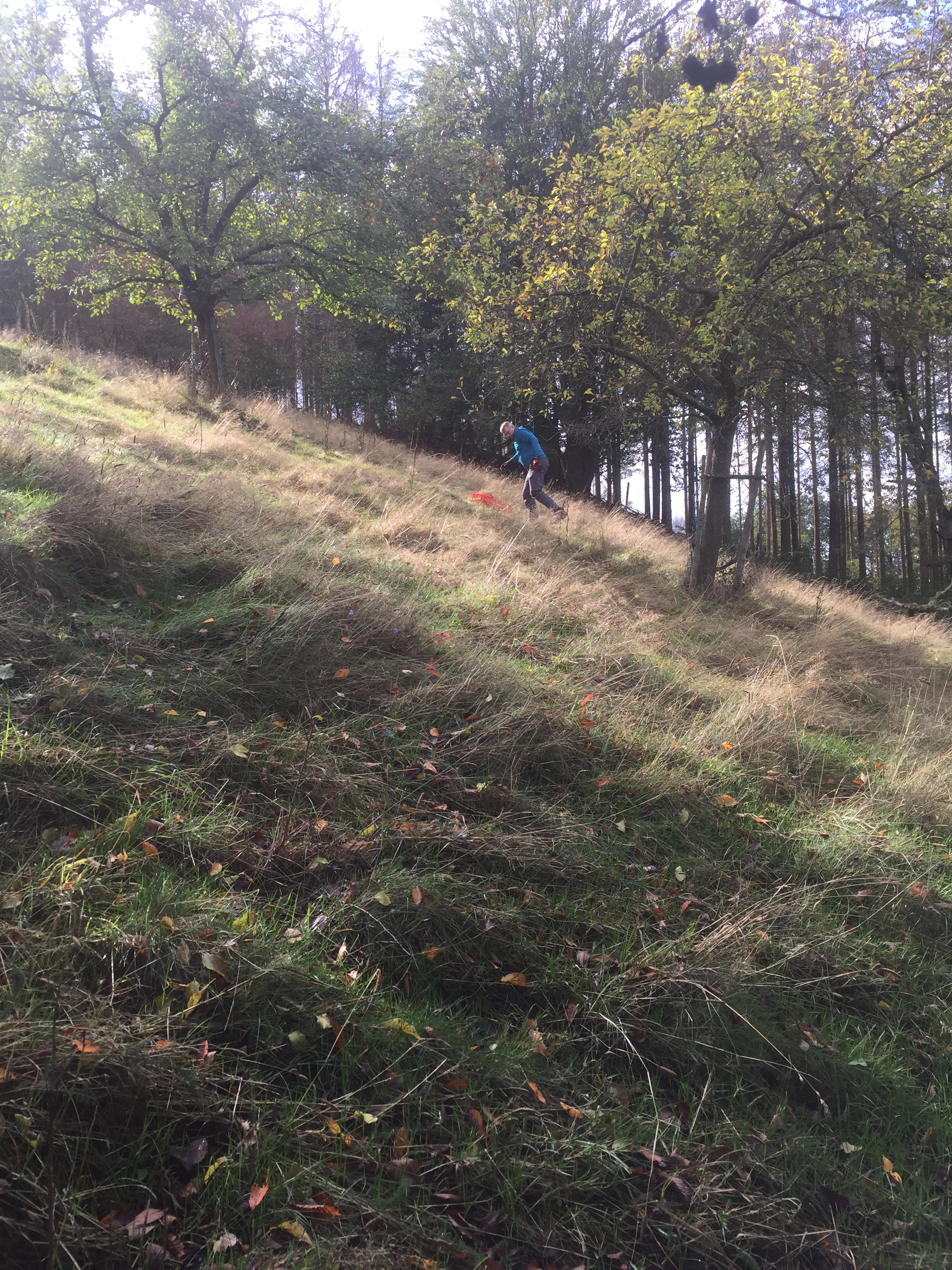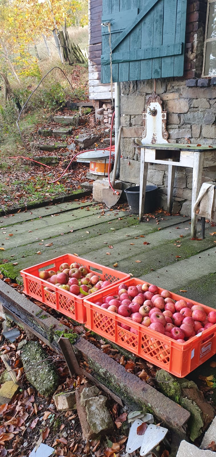 Die Ernte verlangt einiges ab – nicht nur wegen der steilen Hänge, die viel Kraft und Trittsicherheit erfordern. Auch der Transport ist kein leichtes Spiel: Die gefüllten Kisten tragen wir zu Fuß ein gutes Stück bergab bis zum Parkplatz. Jede Ladung ist Schwerstarbeit, denn eine direkte Zufahrt zum Gelände gibt es nicht. Aber am Ende ist es jede Mühe wert – der Geschmack unserer Äpfel ist unvergleichlich.