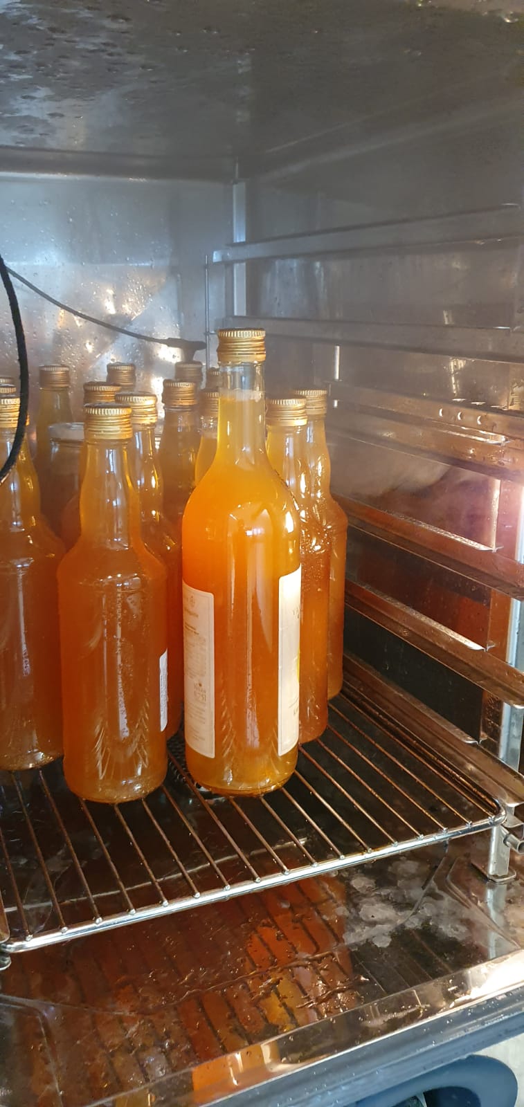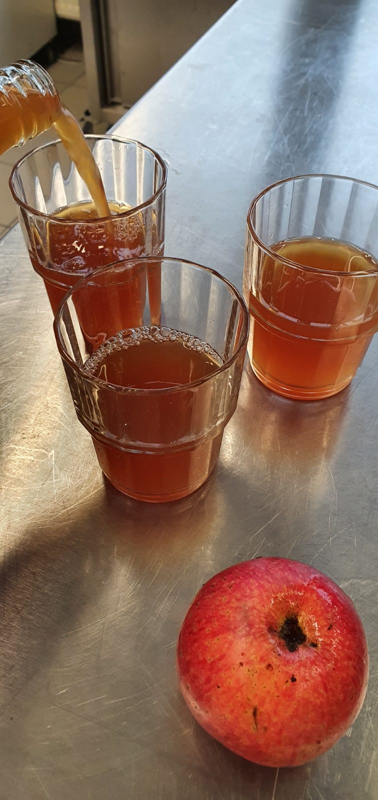 Ein Teil der Ernte haben wir zu Apfeldirektsaft verarbeitet – schonend und mit viel Sorgfalt. Bei 80 °C schonend pasteurisiert – das genügt, weil der Saft durch seinen niedrigen pH-Wert von Natur aus haltbar ist. Danach wurden die Flaschen sofort heruntergekühlt und eingelagert.