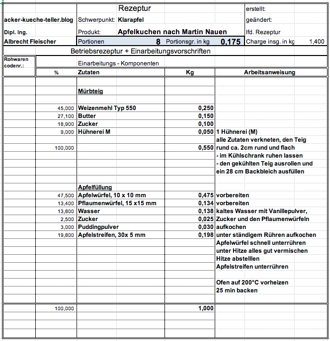 Die Rezeptur beginnt mit einer genauen Bezeichnung, die auch lebensmittelrechtlich bindend ist. Für die Anwendung nutze ich ein Rezepturformat in Form einer Excel-Tabelle.